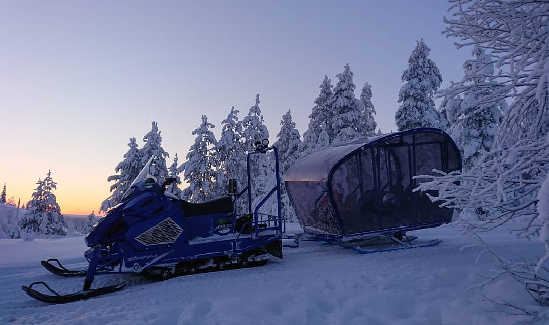 Lähde mukaan seikkailuun Eränkävijöistä tutulla lämmitetyllä reellä, jota suuri moottorikelkka vetää.