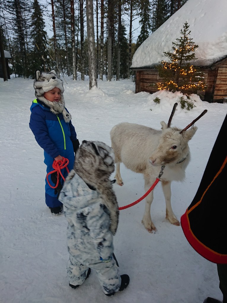 Lyhyen ajelun jälkeen pääsemme lähietäisyydeltä ruokkimaan ja rapsuttelemaan poroja samalla kuulemme tarinaa porojen vuoden kulusta.