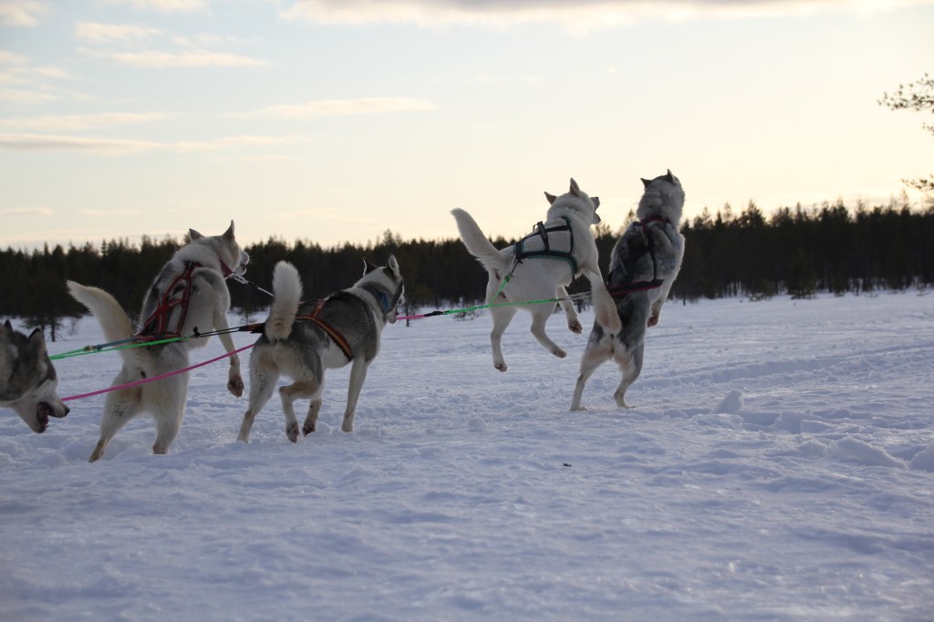 Iloiset hännänheiluttajat odottavat innokkaina lähtöä seikkailulle lumisiin metsiin. Alkuun husky mucher antaa ajo-opetuksen.